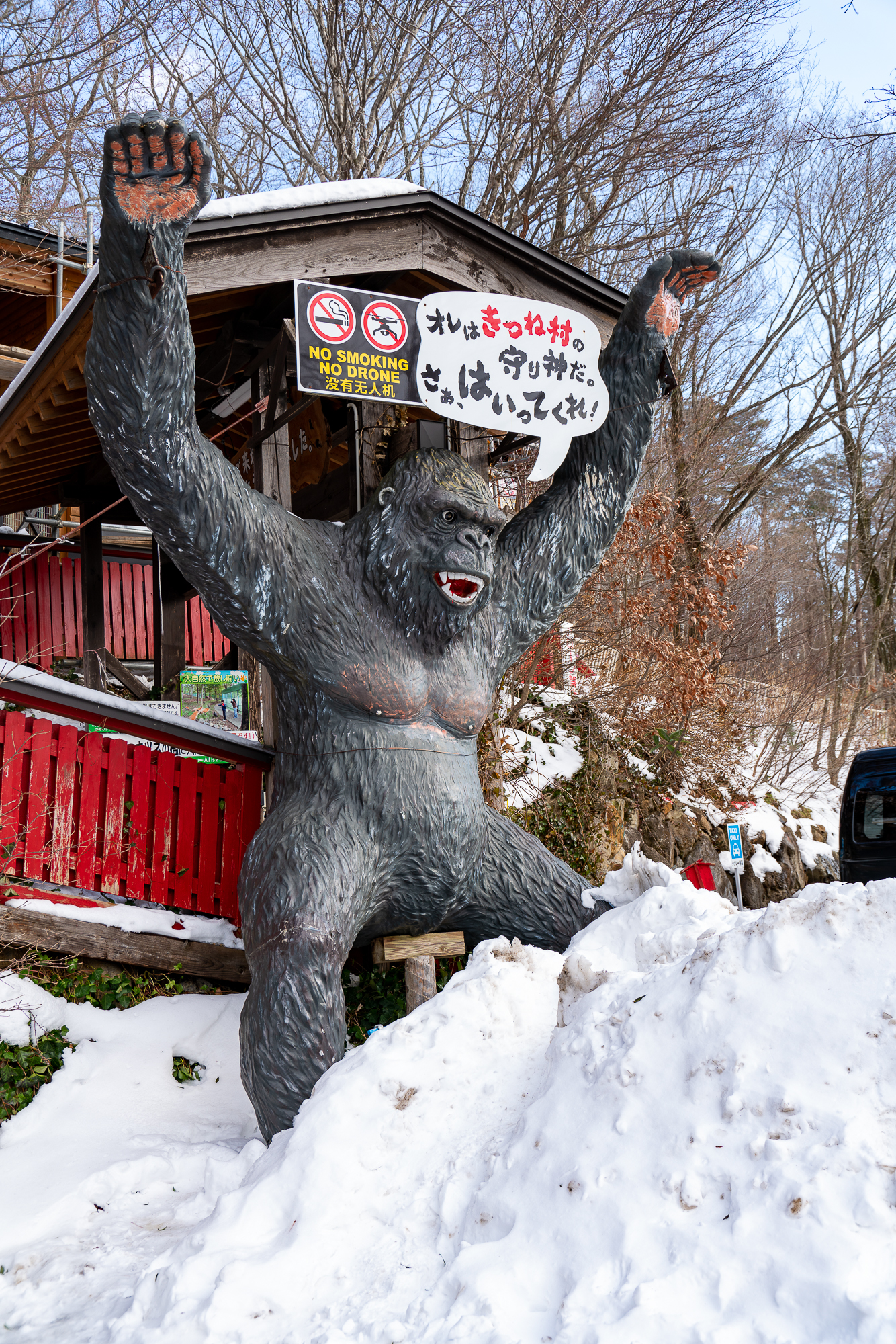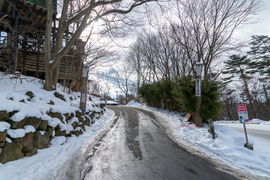 駅前は雪が積もっているということはなかったのですが、キツネ村は結構山奥ということもあり雪が積もっていました。